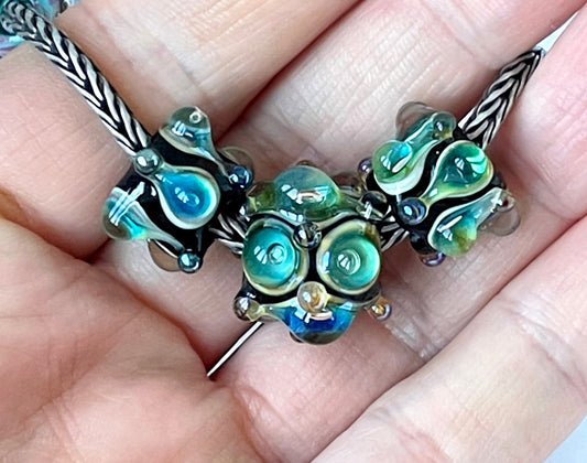 Our Lampwork beads are hand made by artists around the world, using a torch and glass rod which is fired and annealed in a kiln for strength, and smoothed for use in show leads.