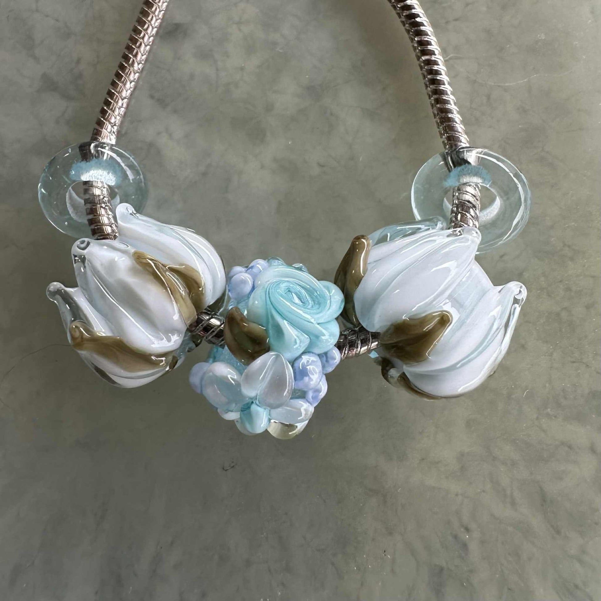 These beads are handmade by the glass artist Heather Davis Setting options are all in one focal cluster or set separately along the lead.