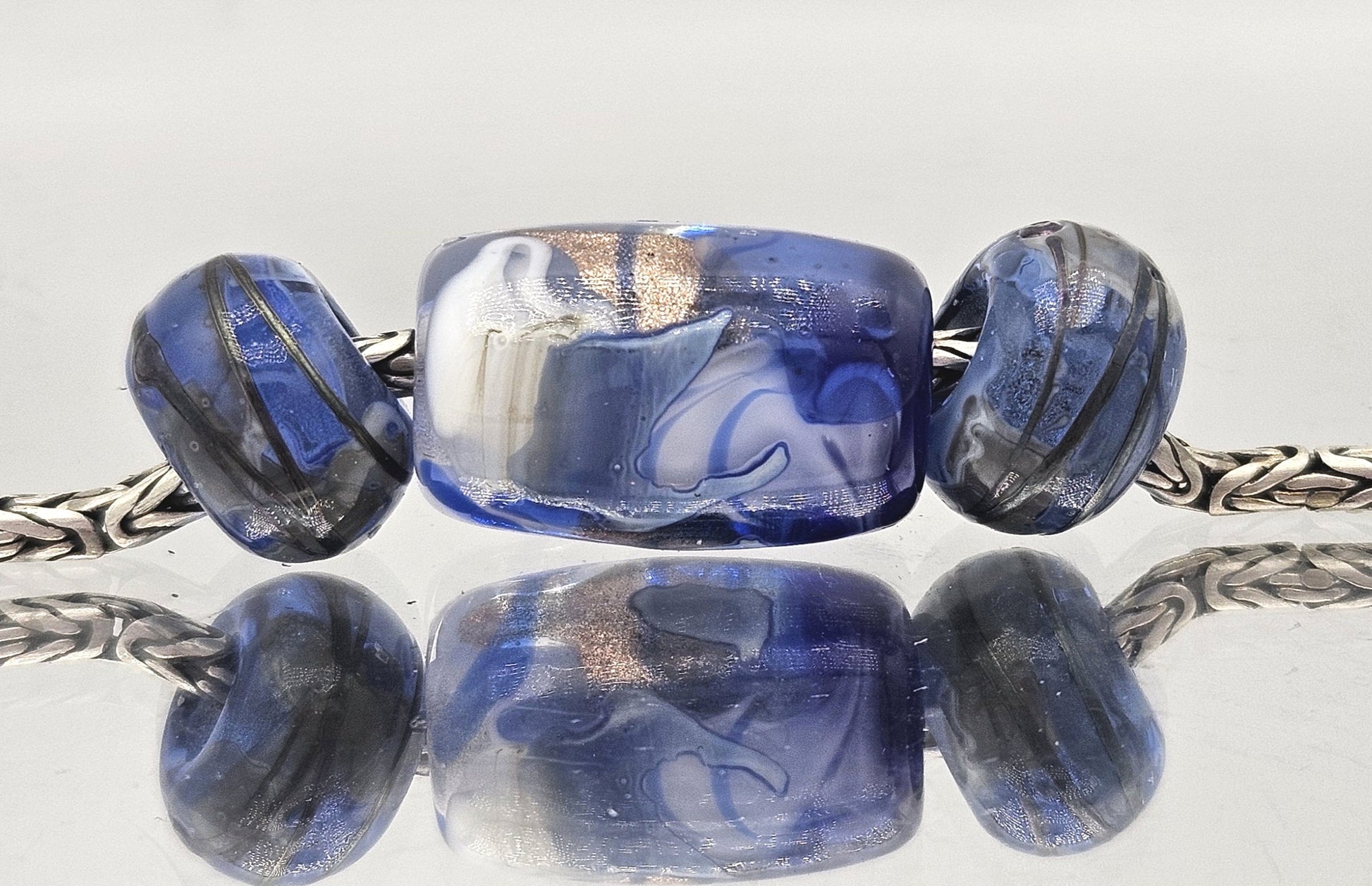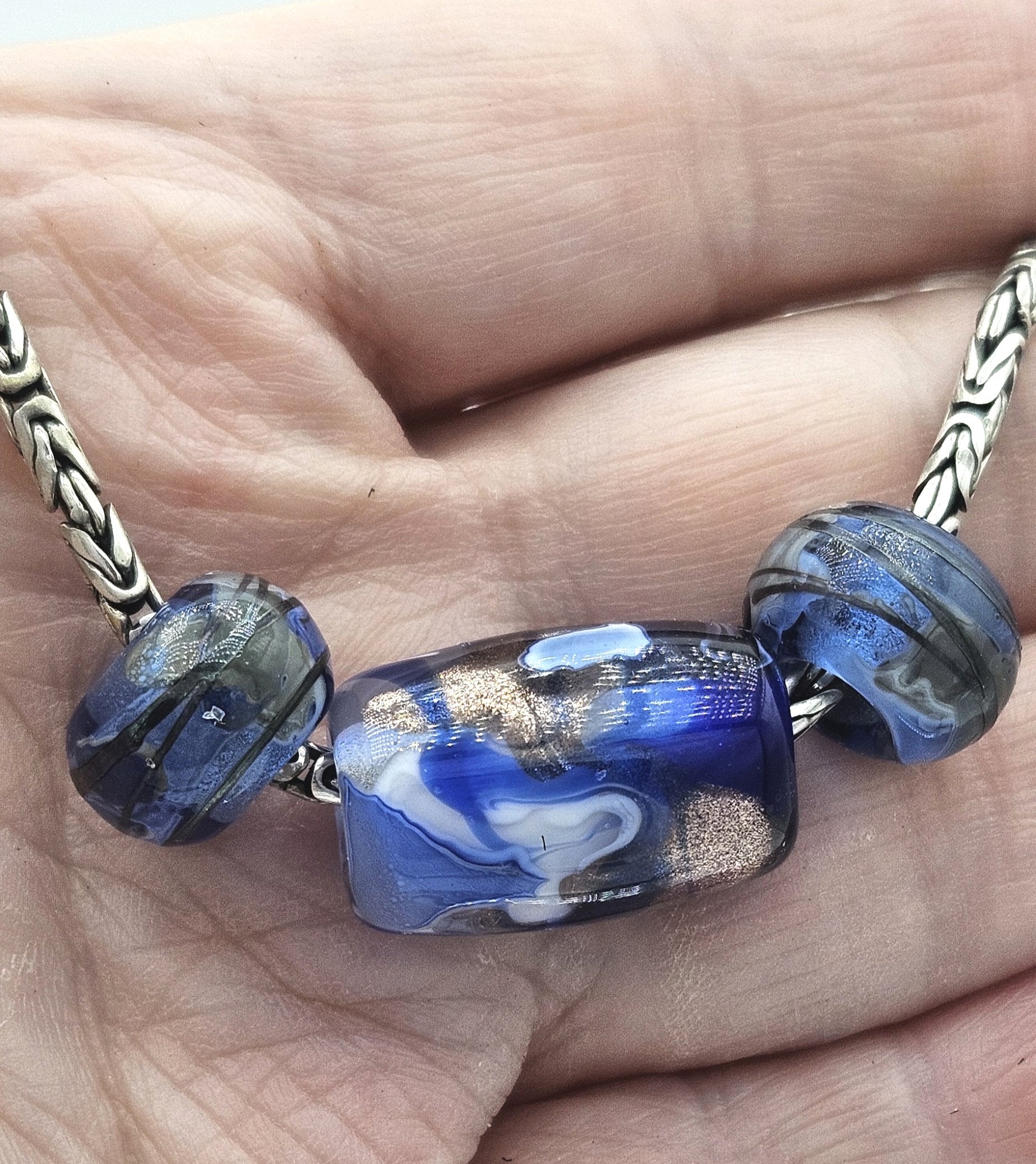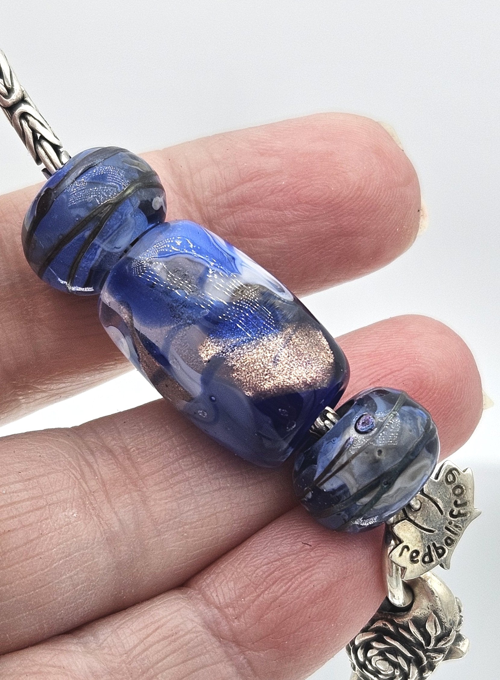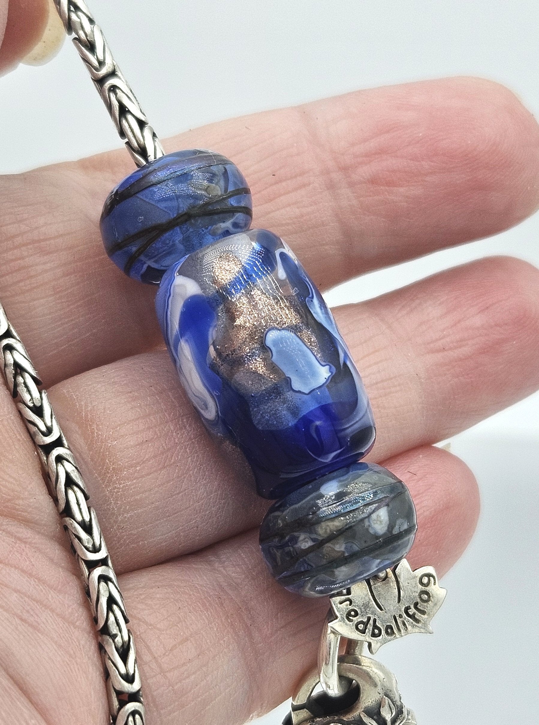 These beads are handmade by the glass artist Julie Burgard. Setting options are all in one focal cluster or set separately on the lead.