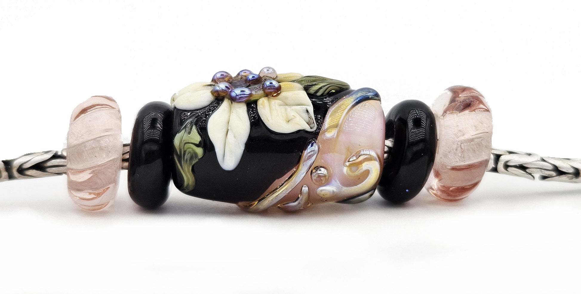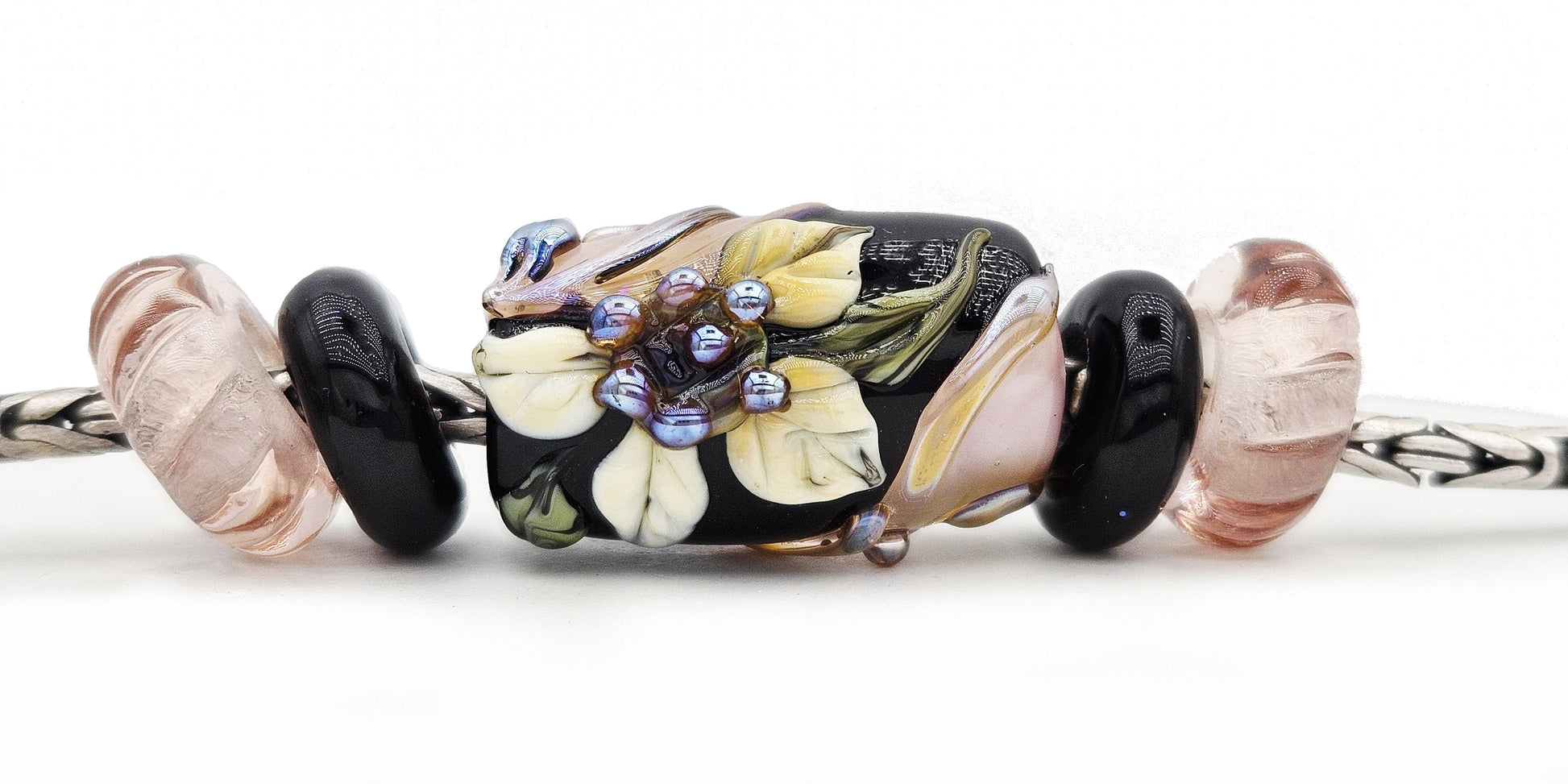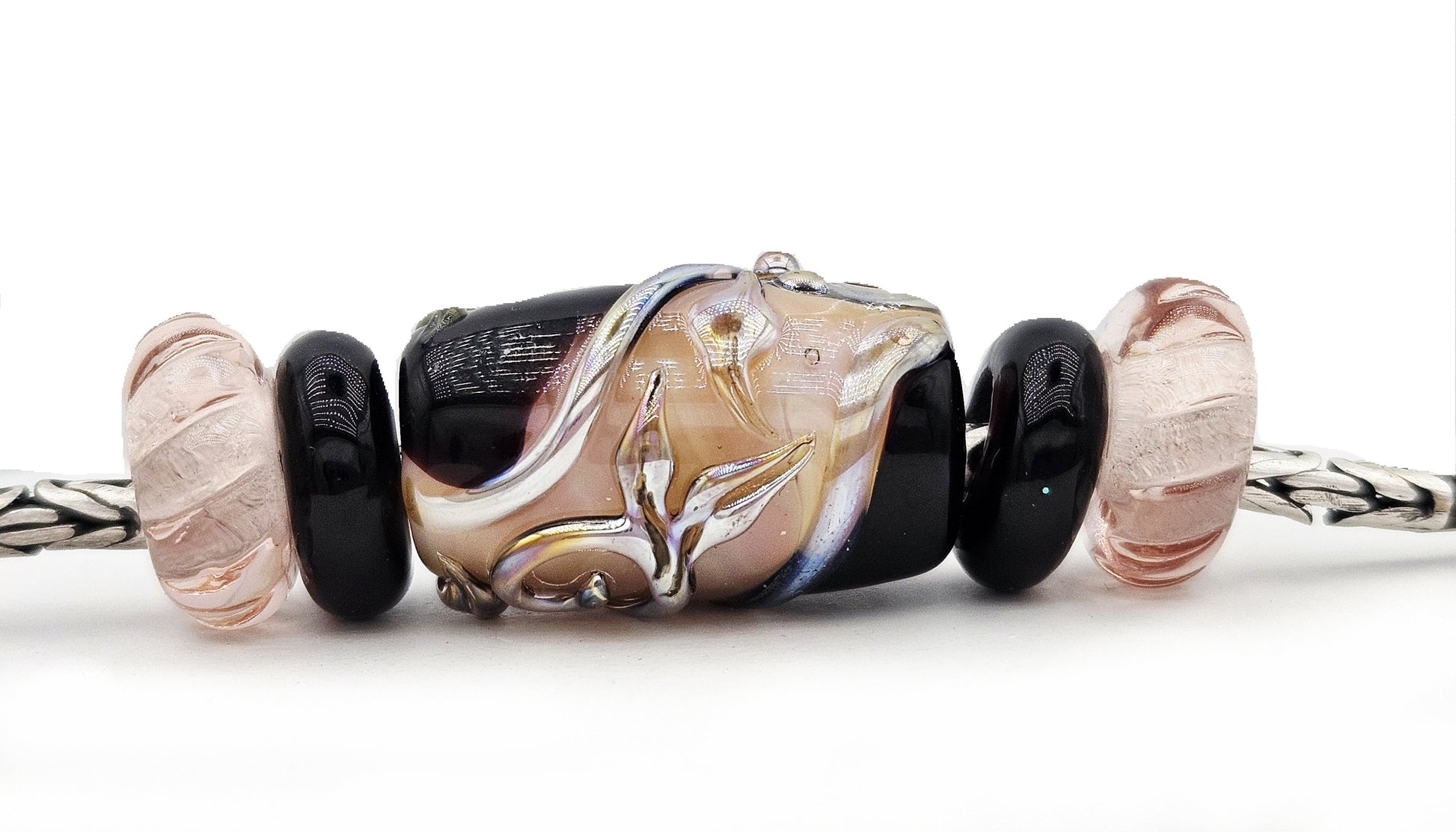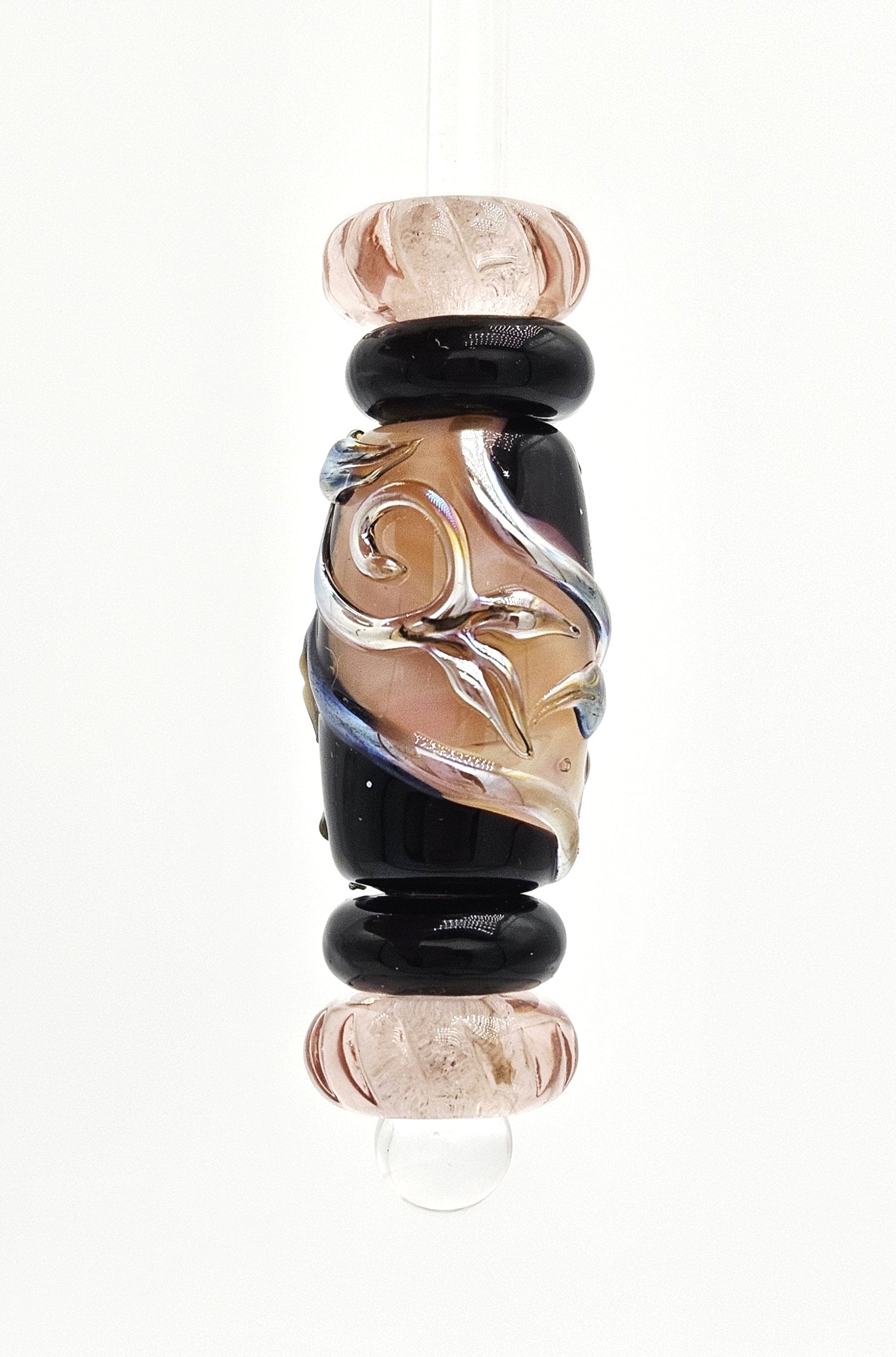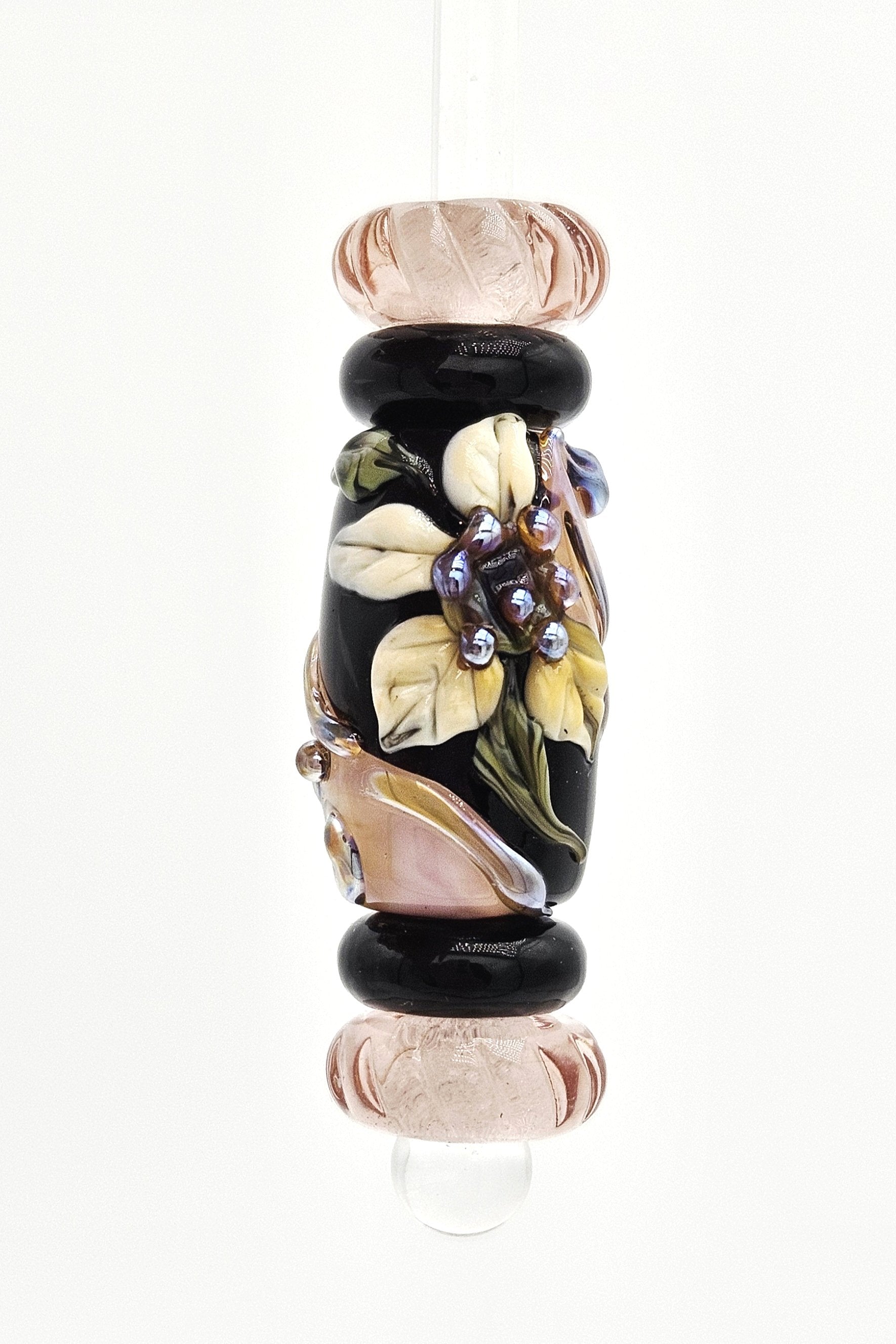 These beads are handmade by the glass artist Stephanie Dieleman. Setting options are all in one focal cluster or set separately along the lead.