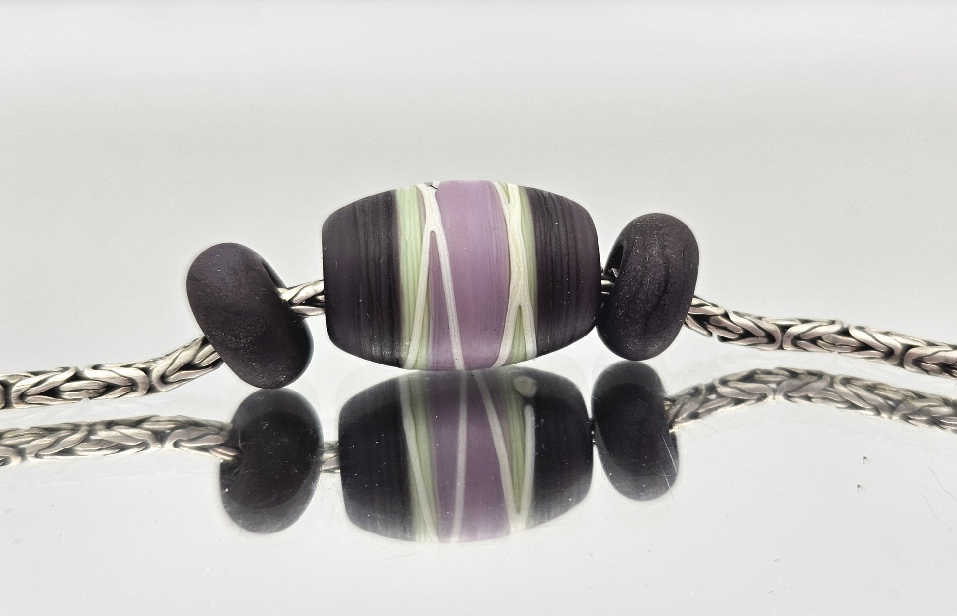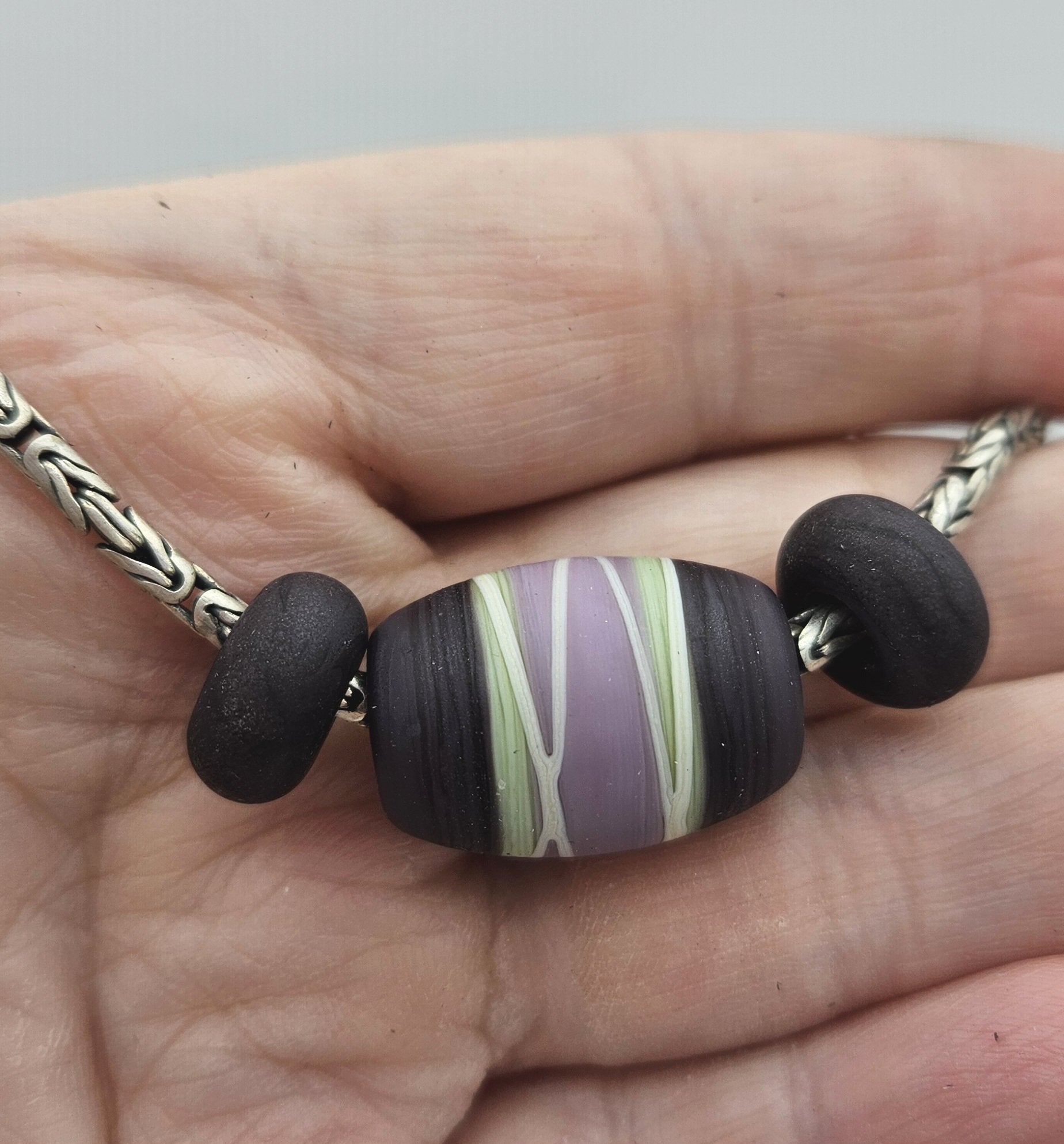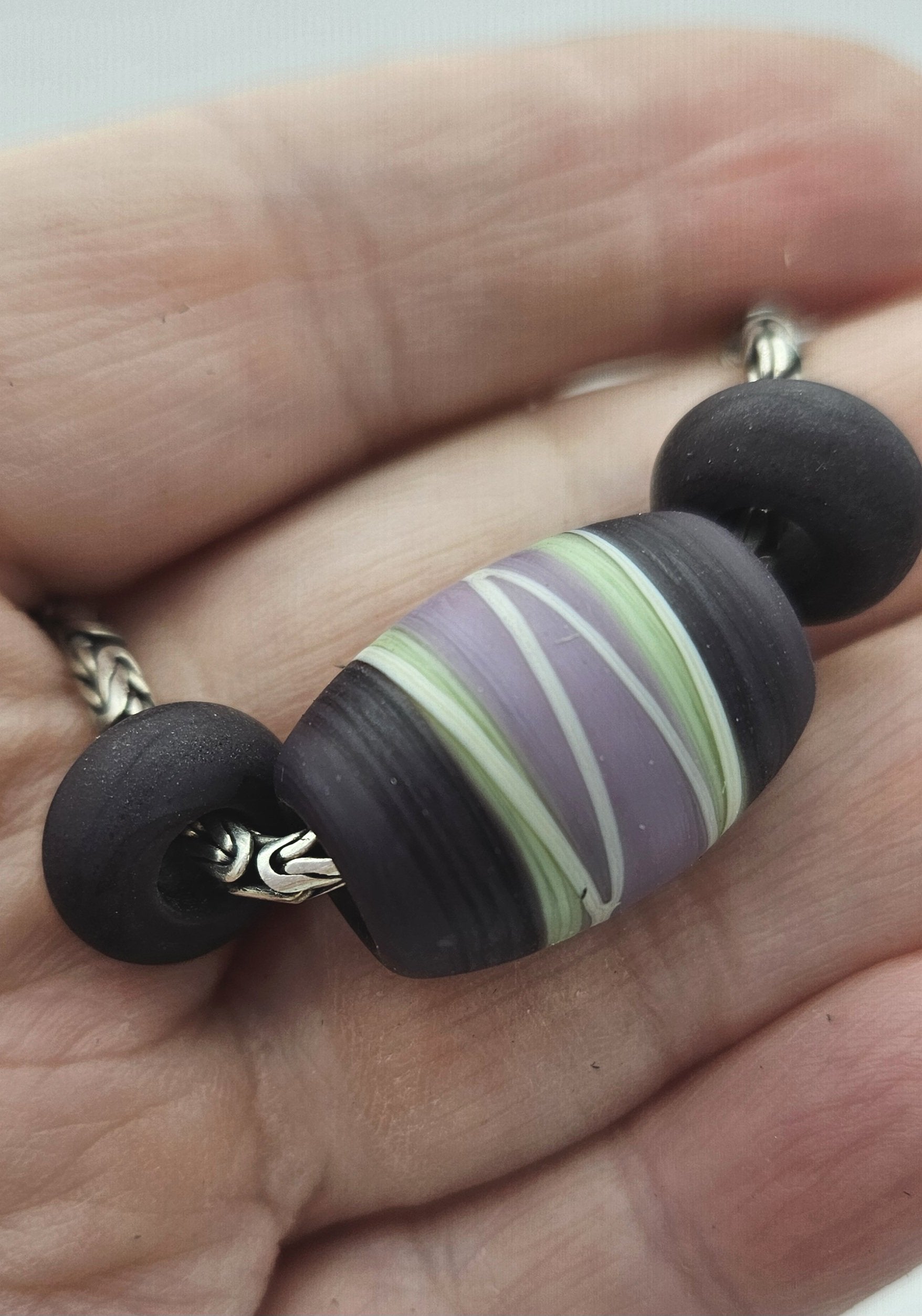 These beads are handmade by the glass artist Julie Burgard. Setting options are all in one focal cluster or set separately on the lead.
