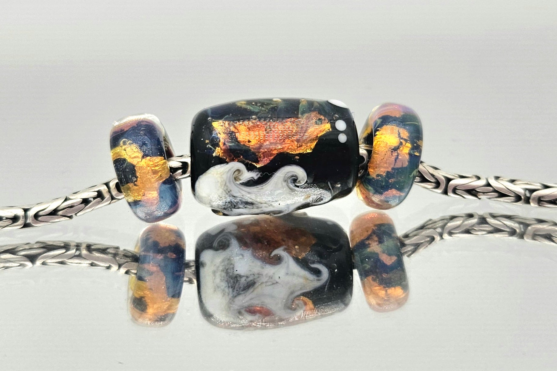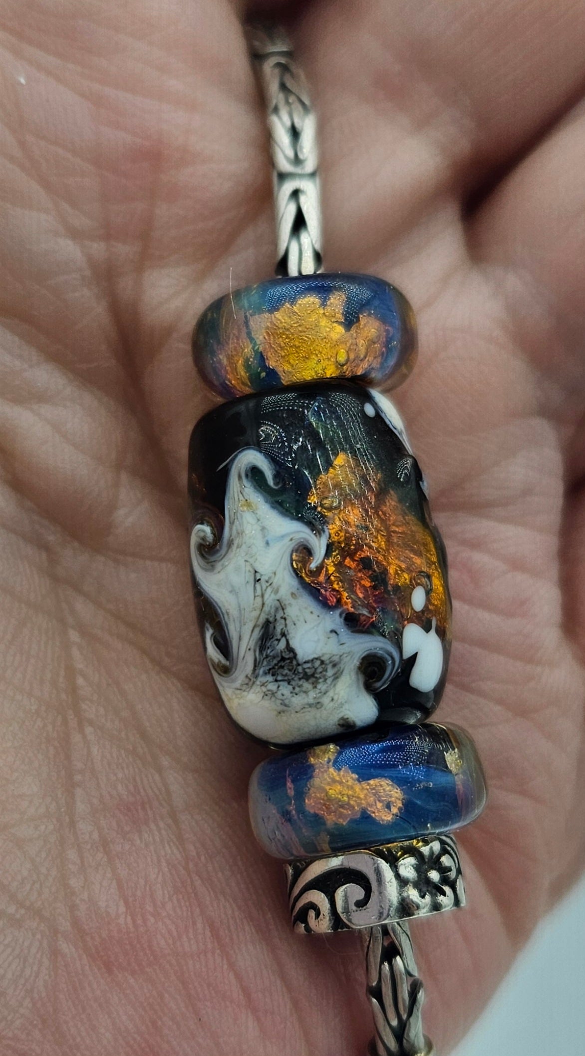 These beads are handmade by the glass artist Mardi Brown. There is a fiery amber super sparkle, along with white, black, and all shades of blue and a golden sparkle, swirled into this gorgeous bead set. Pictures do it no justice.