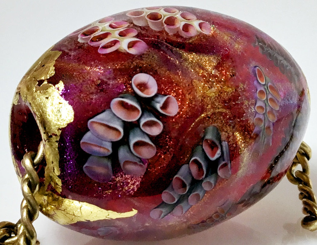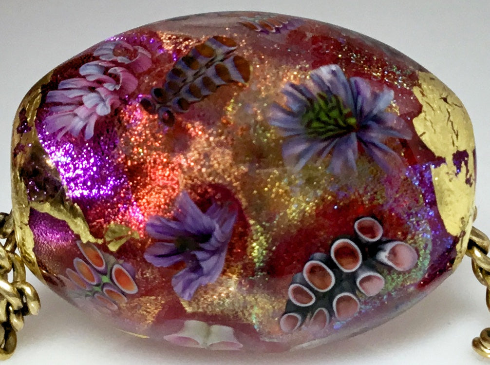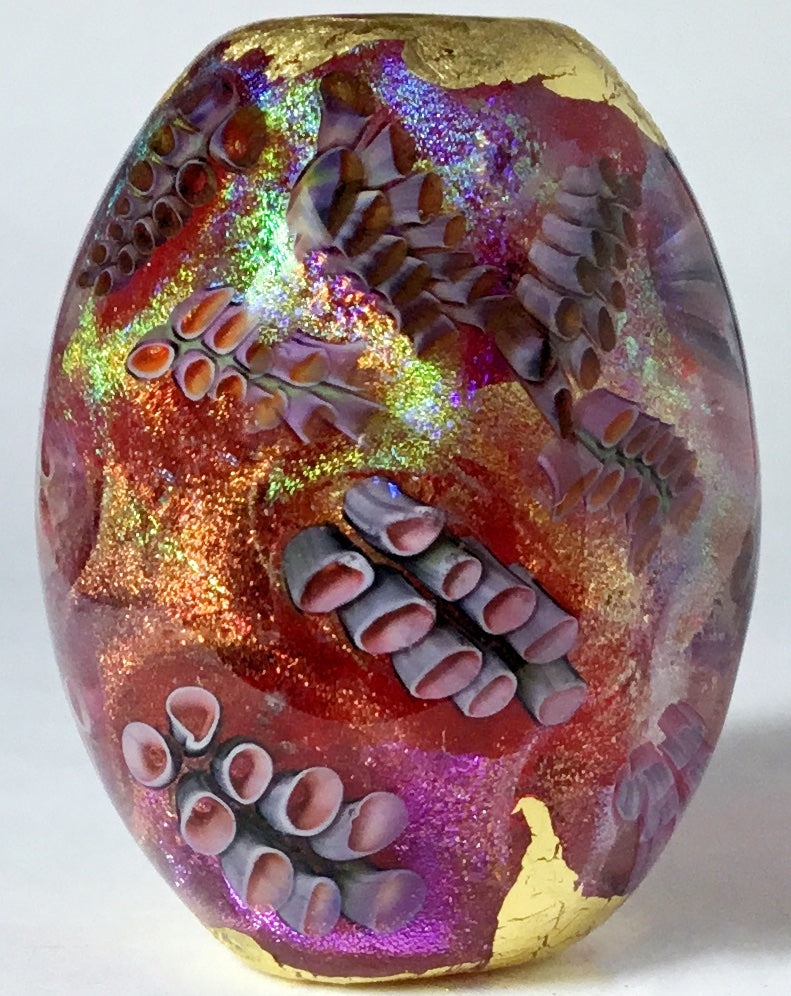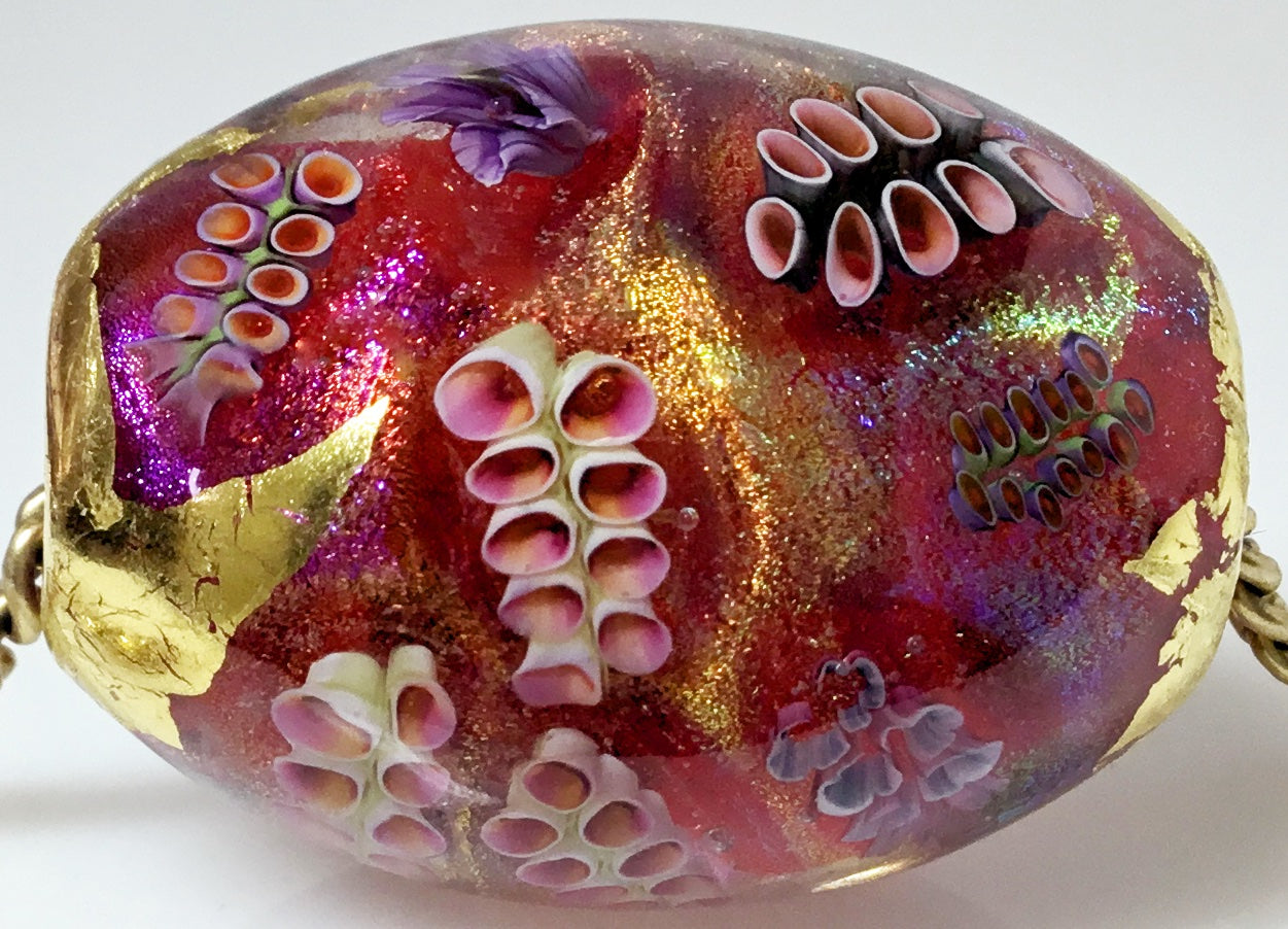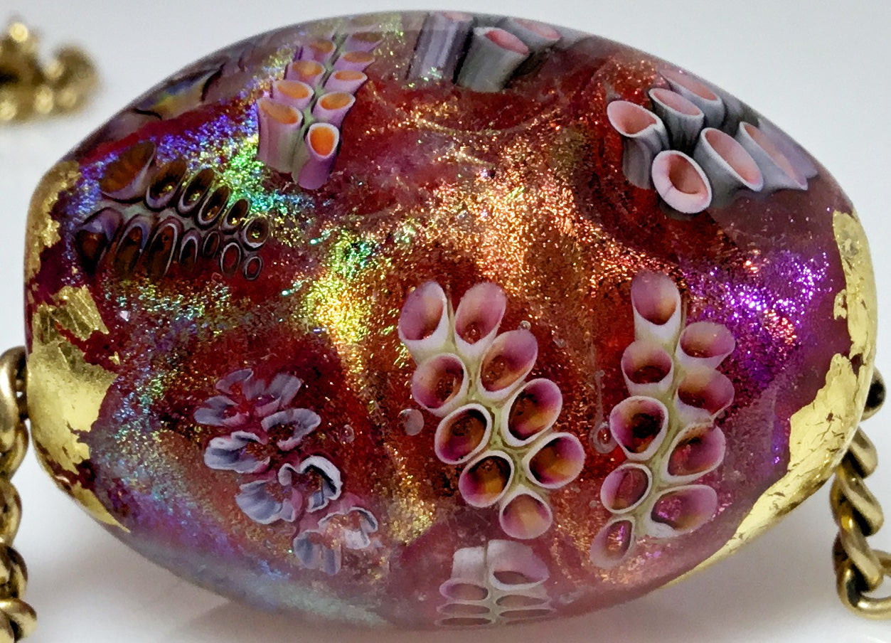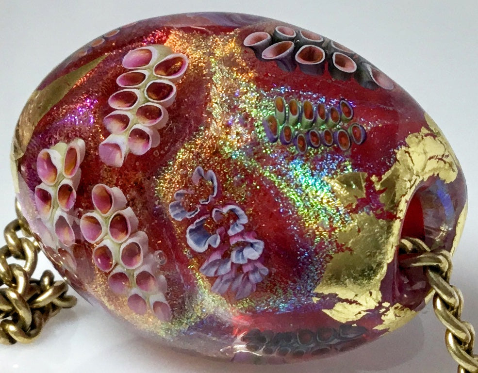 Single large focal bead handmade by the glass artist Lee Woodburn. This is a color shifting, light catching glass which is hard to photograph but has red, peach, pink, gold, fuchsia sparkling within. This is too large for small to mid size breed leads. It is excellent for minimalist settings for giant breeds or for gorgeous jewelry options.