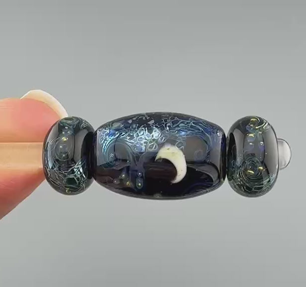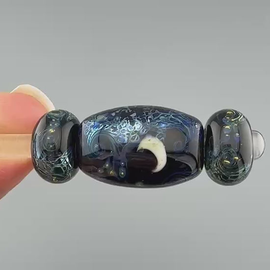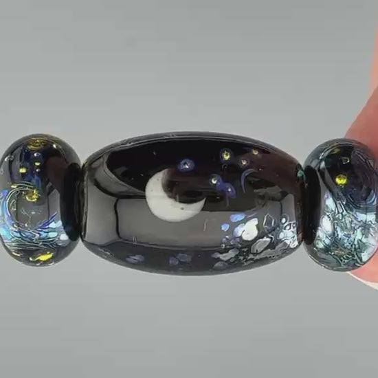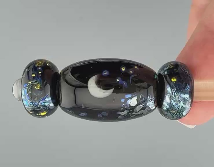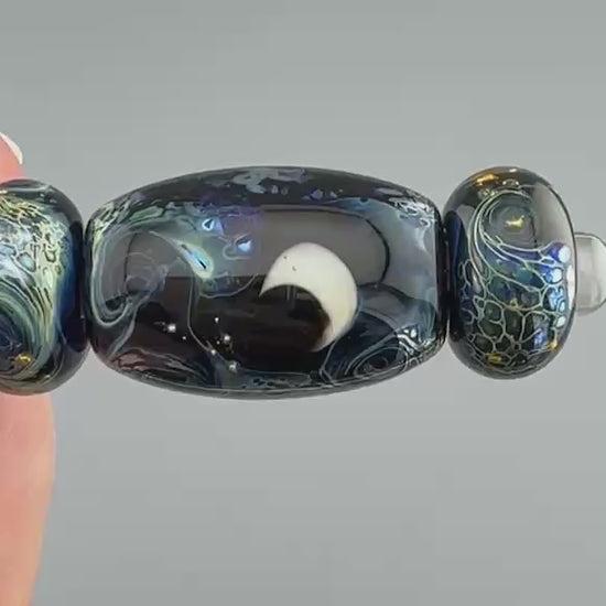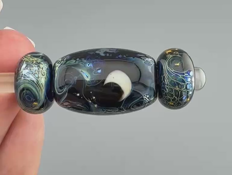 These beads are handmade by the glass artist Elena Avinskaya. Setting options are all in one focal cluster or set separately along the lead. Please review the video for the ones in stock currently, which have a little fatter look and are simply stunning!