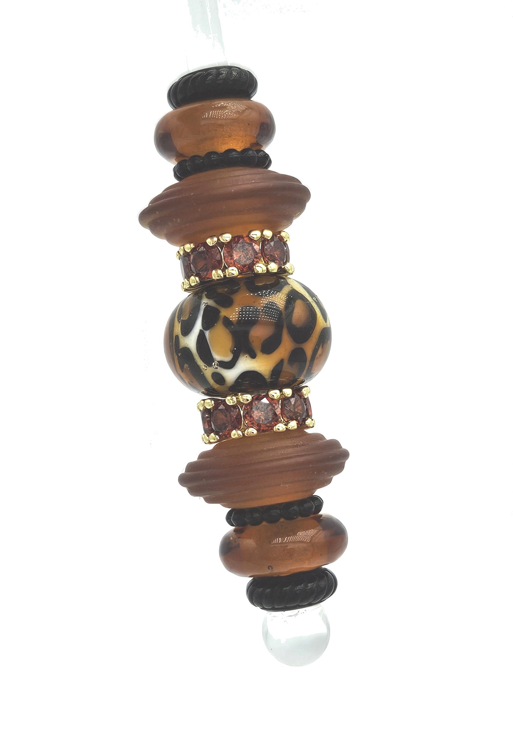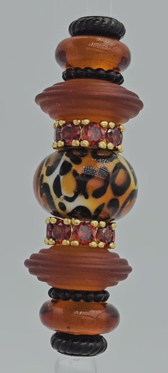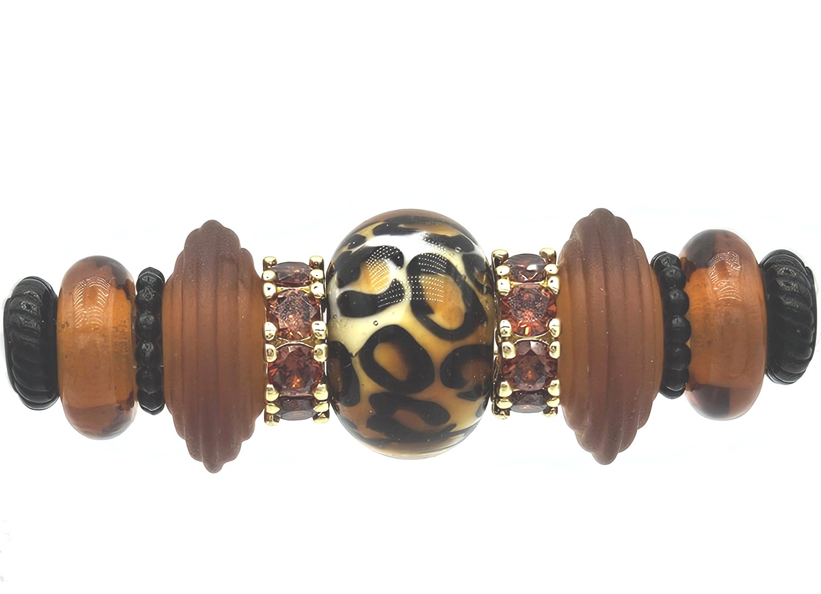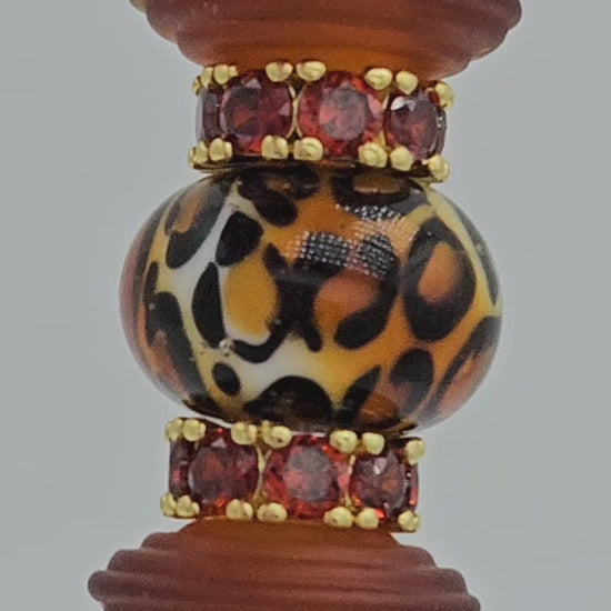 These beads are handmade by the glass artist Elena Tszian. Set includes animal print focal and 4 glass side beads which may be exchanged with other available colors. Shown with black and gold hardware for example only. Many hardware colors and options available.