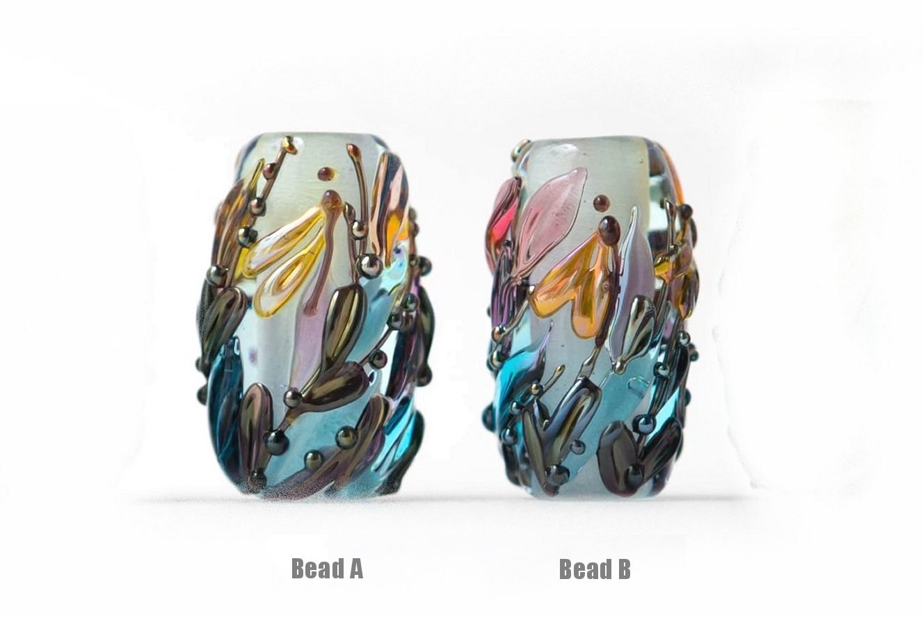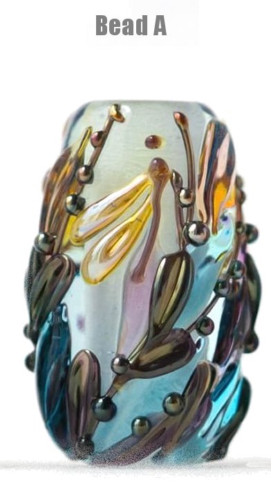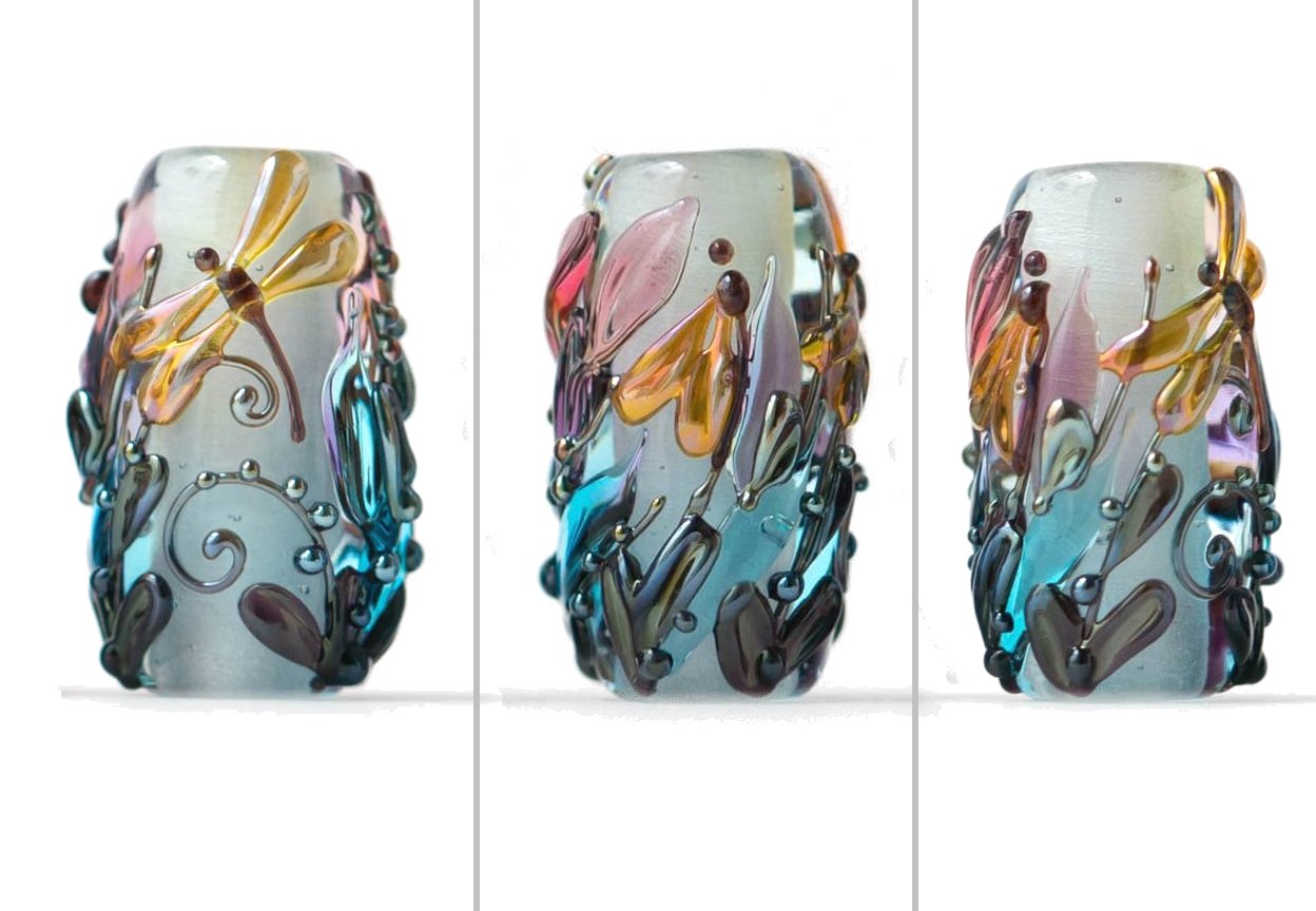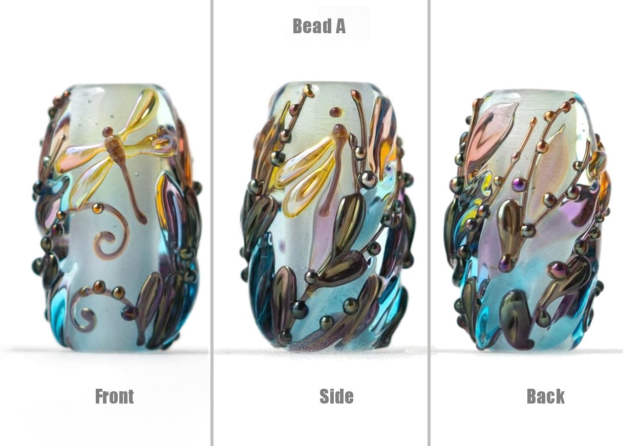 This beads is handmade by the glass artist Olia Oleksiichuk. Side beads will accompany this gorgeous focal at no additional cost. This is a purchase of 1 focal and 2 smaller glass sides, not pictured. There are two different beads pictured in photos, showing the beads all the way around. The photos labeled with 'front, side, back' are just one bead each in three pics.