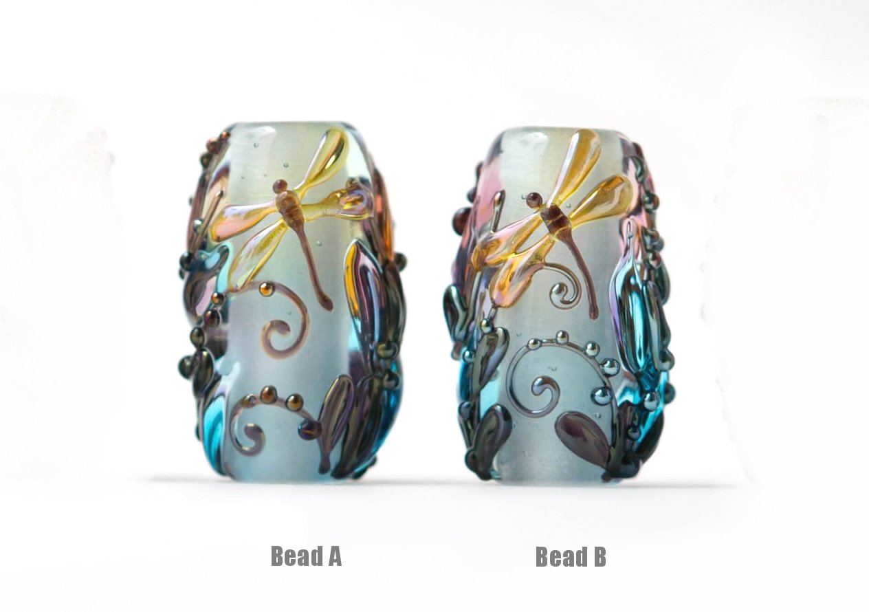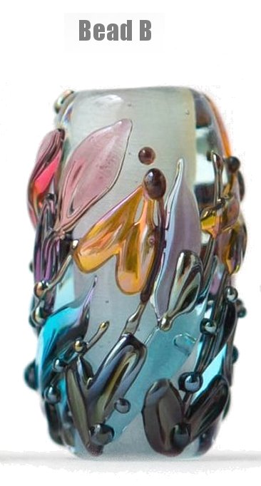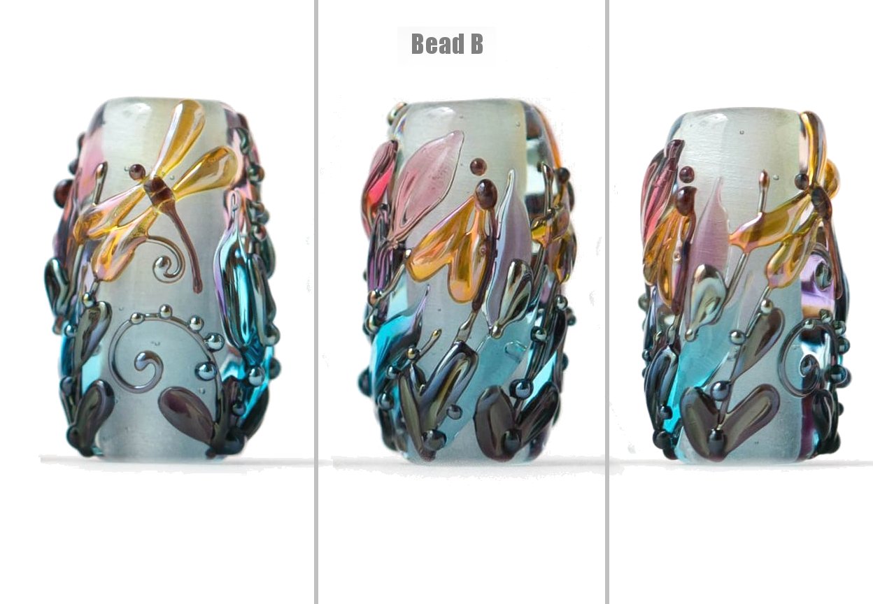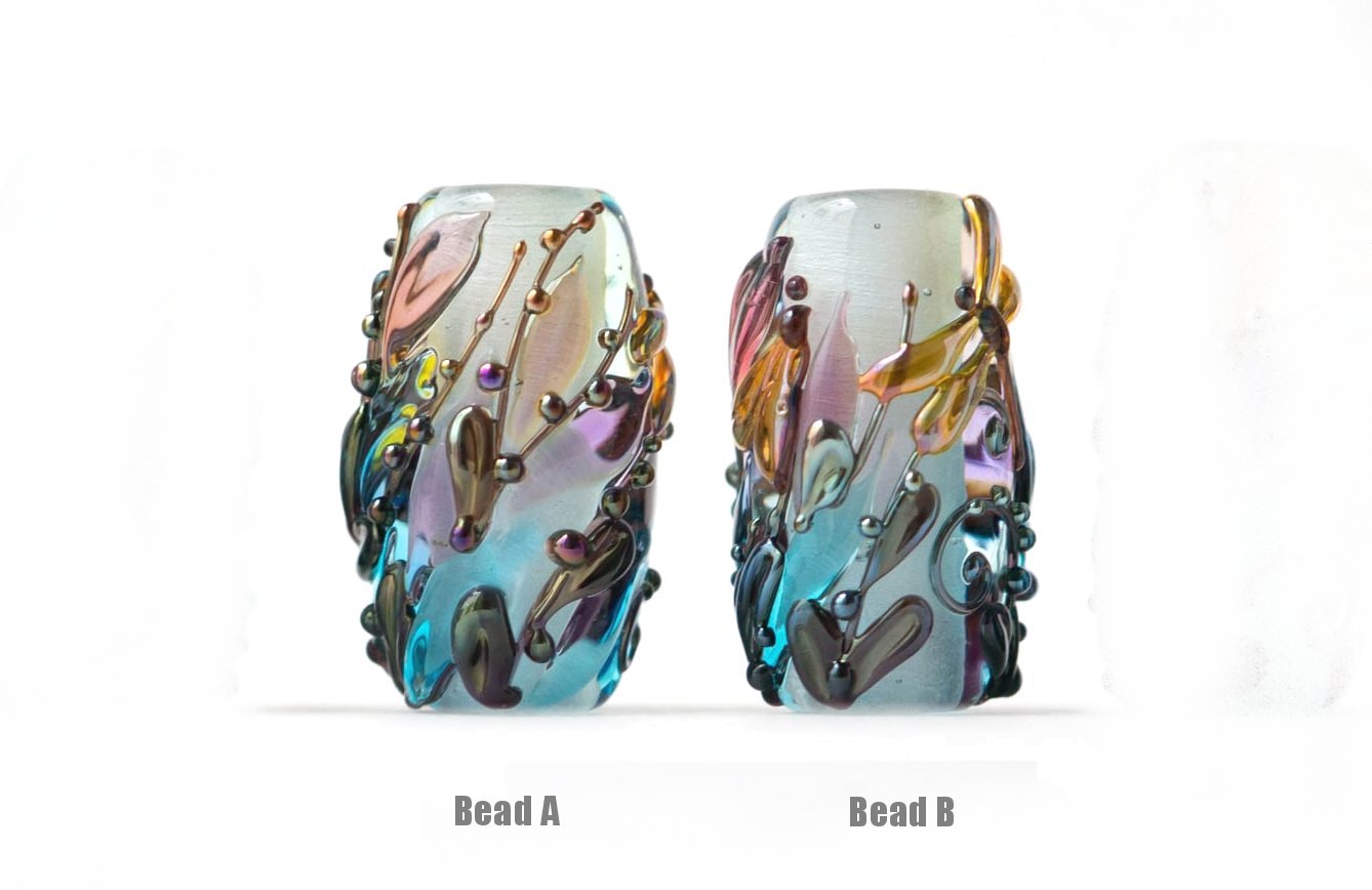 This beads is handmade by the glass artist Olia Oleksiichuk. Side beads will accompany this gorgeous focal at no additional cost. This is a purchase of 1 focal and 2 smaller glass sides, not pictured. There are two different beads pictured in photos, showing the beads all the way around. The photos labeled with 'front, side, back' are just one bead each in three pics.
