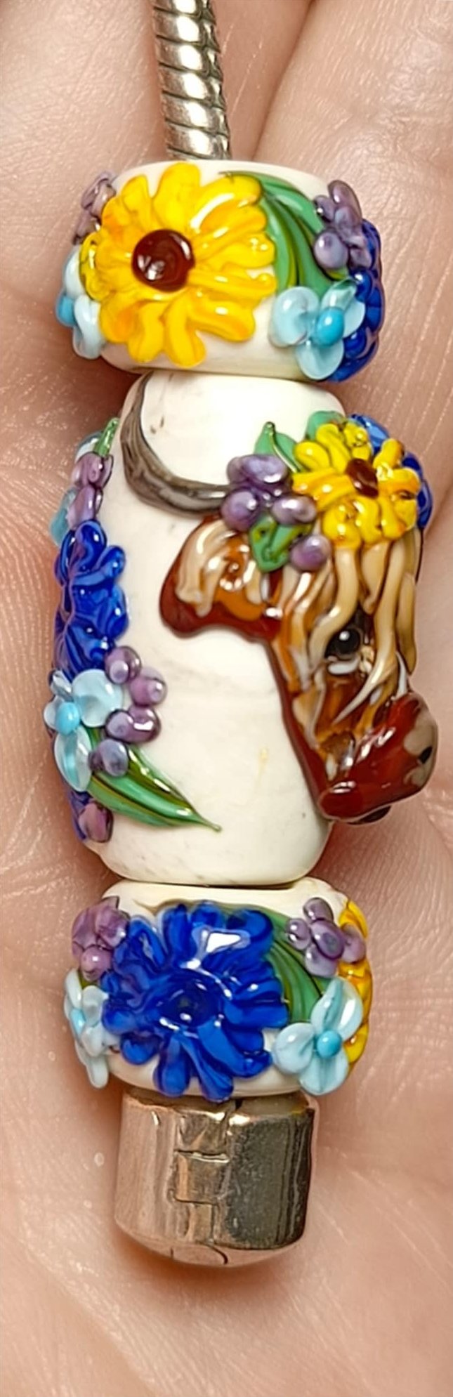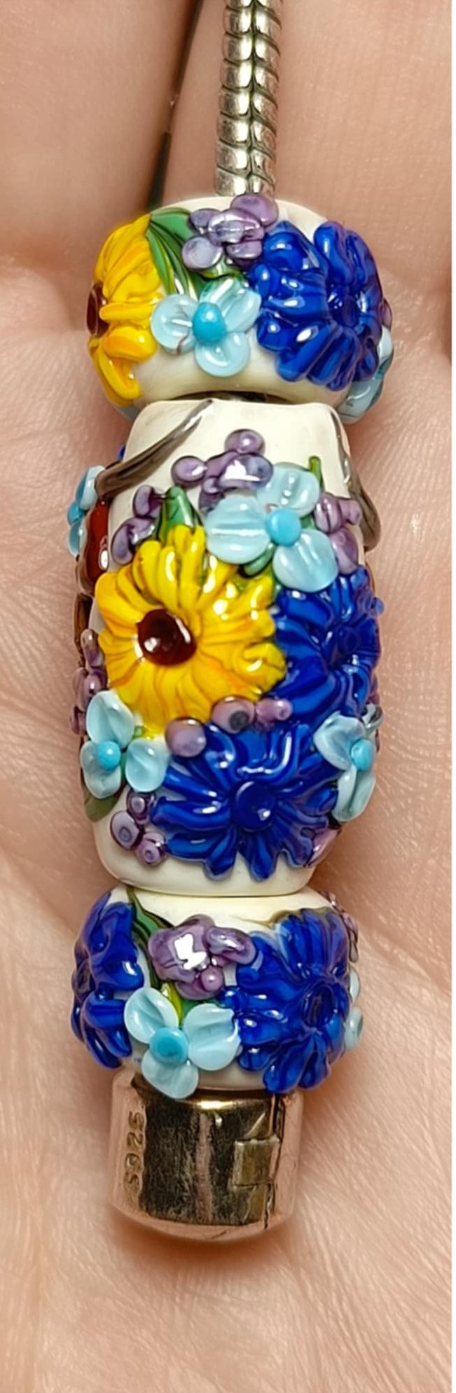 These beads are handmade by the glass artist Elena Solopova. Setting options are all together in one focal grouping or set separately along the lead.