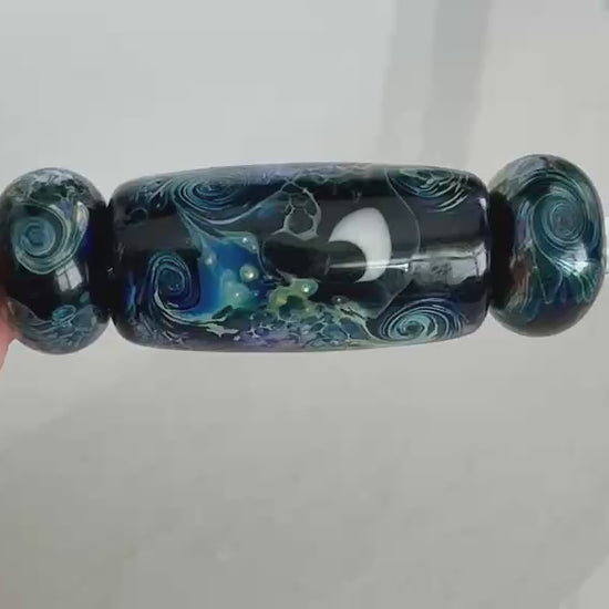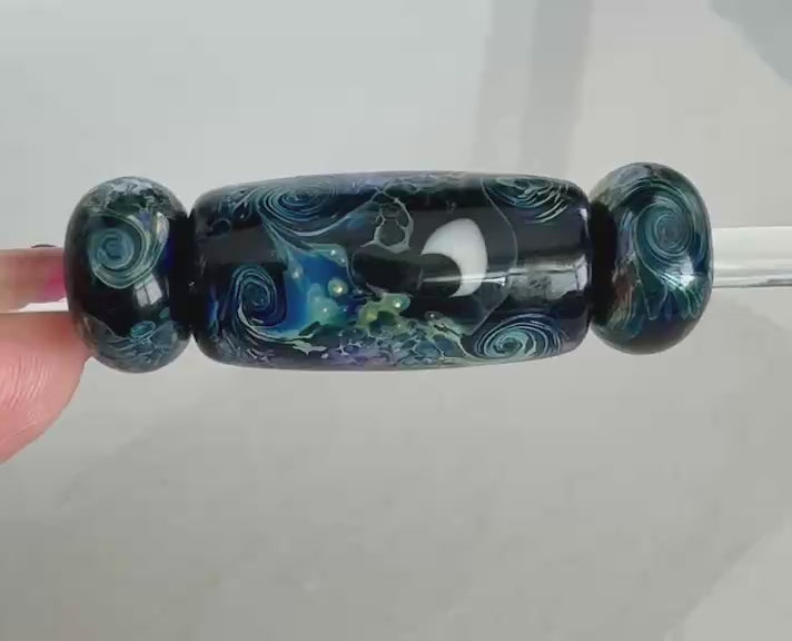 These beads are handmade by the glass artist Elena Avinskaya. Setting options are all in one focal cluster or set separately along the lead.