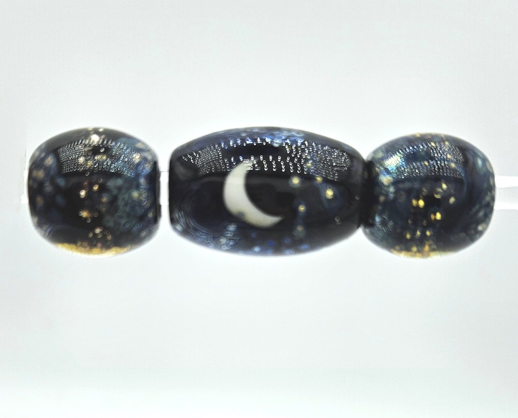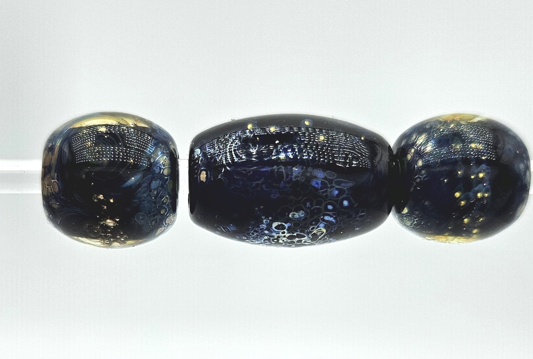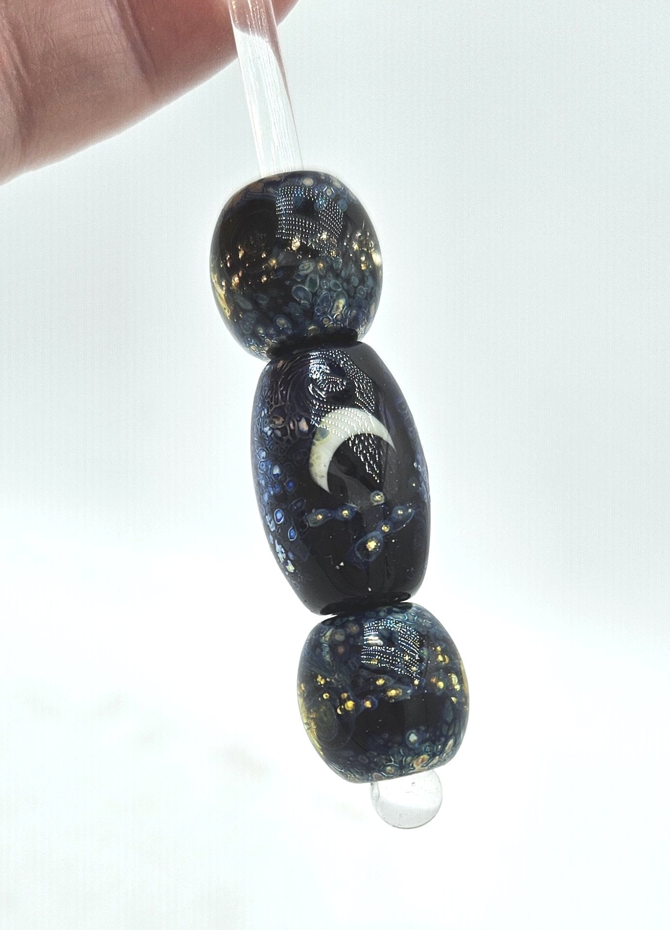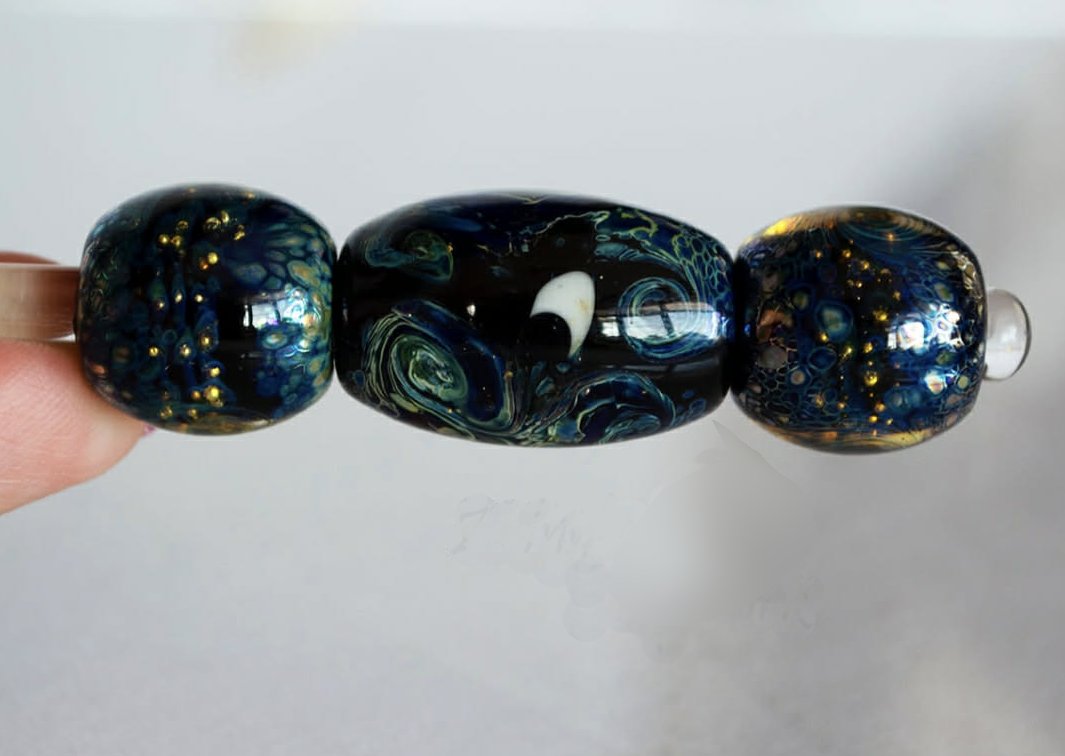 **There are several versions of this style bead by this artist. This is the larger set of beads and preferred for medium to larger breeds. For smaller breeds see the Galaxy Night Sky, Galaxy Night Skies or Moonlit seas versions.