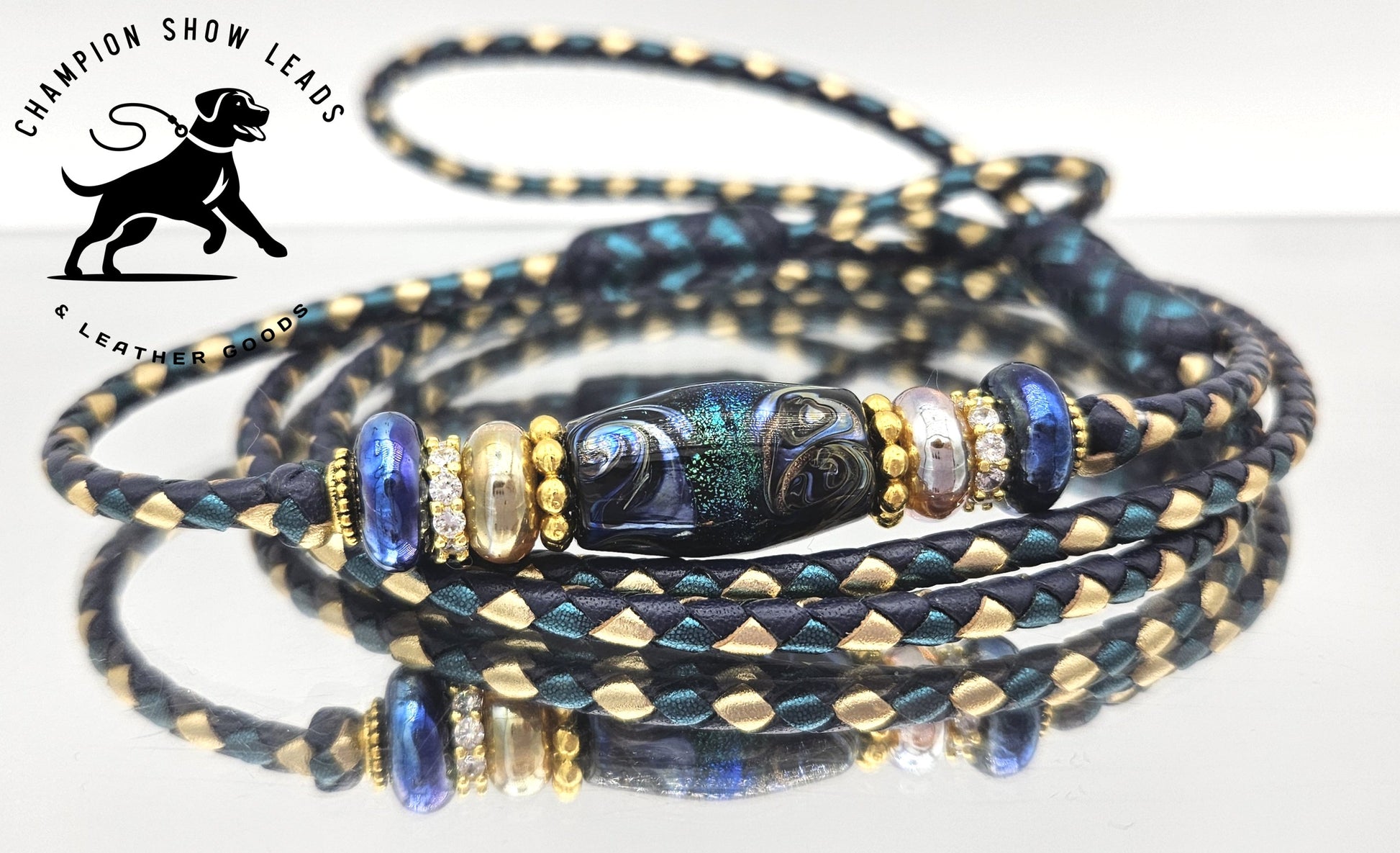 Take care of your glass as you would any glass item. Store your lead in the bag it came in or in a cloth bag and clean glass with a damp cloth if needed. Leather conditioner is not for use on glass beads or their settings.