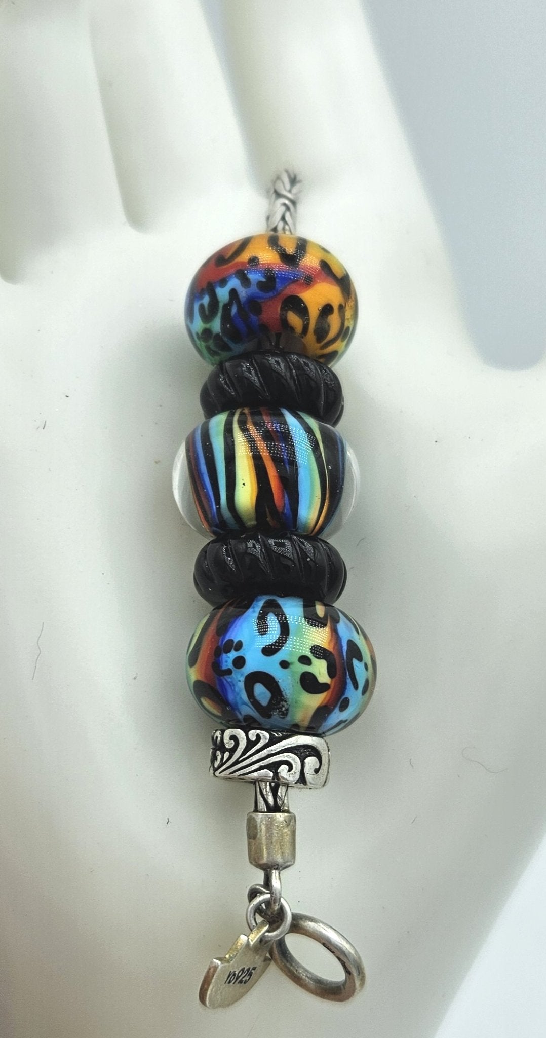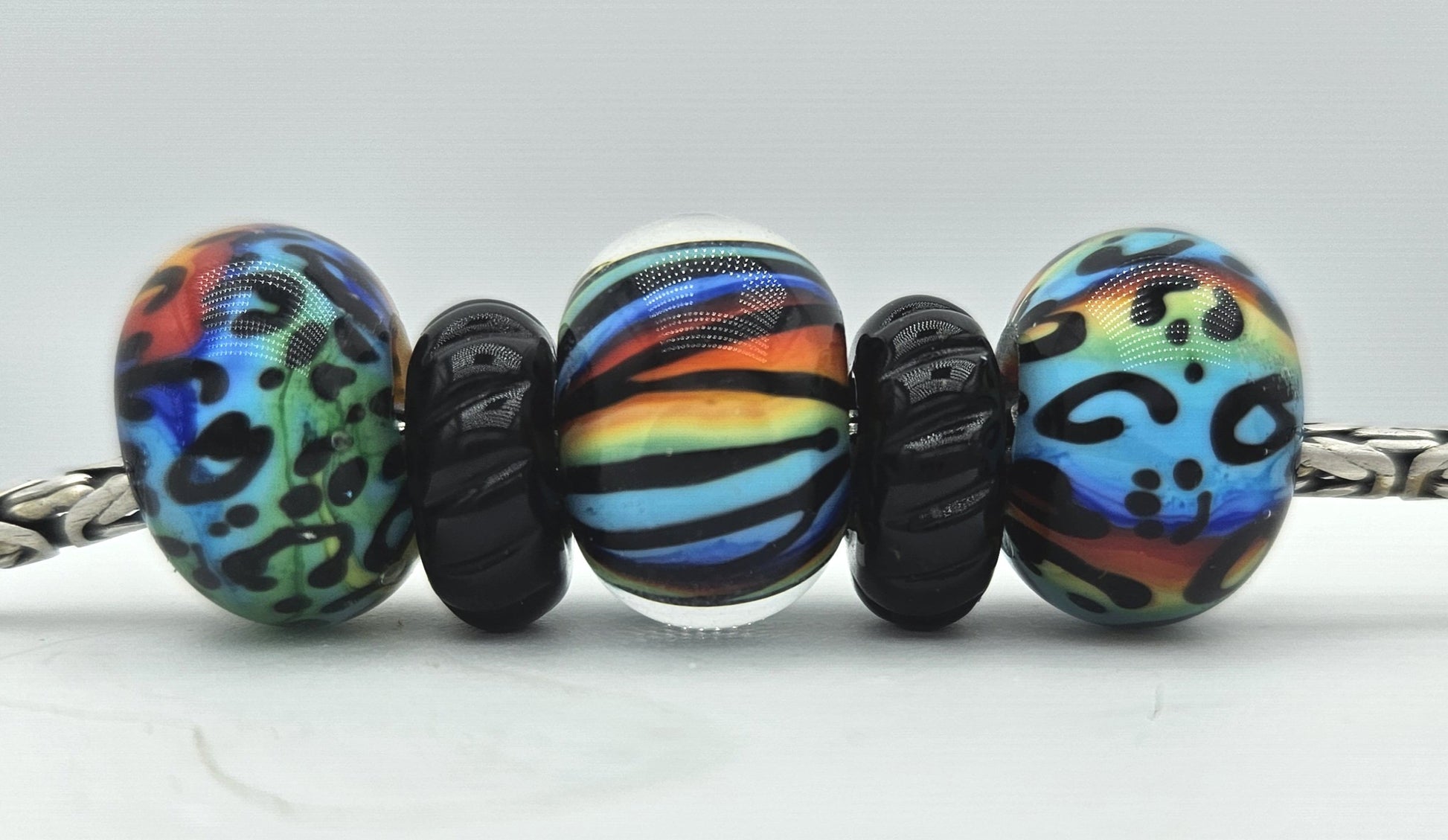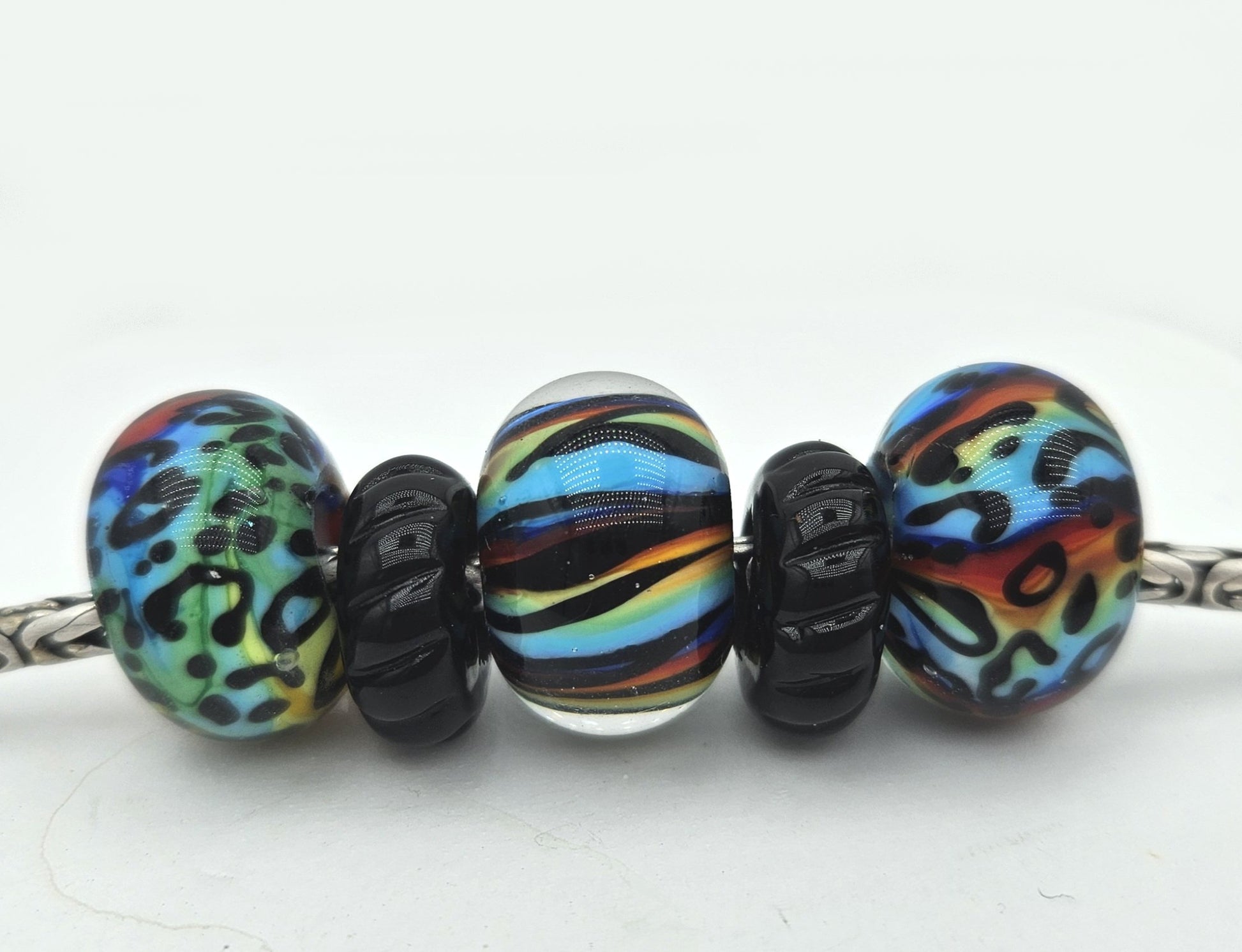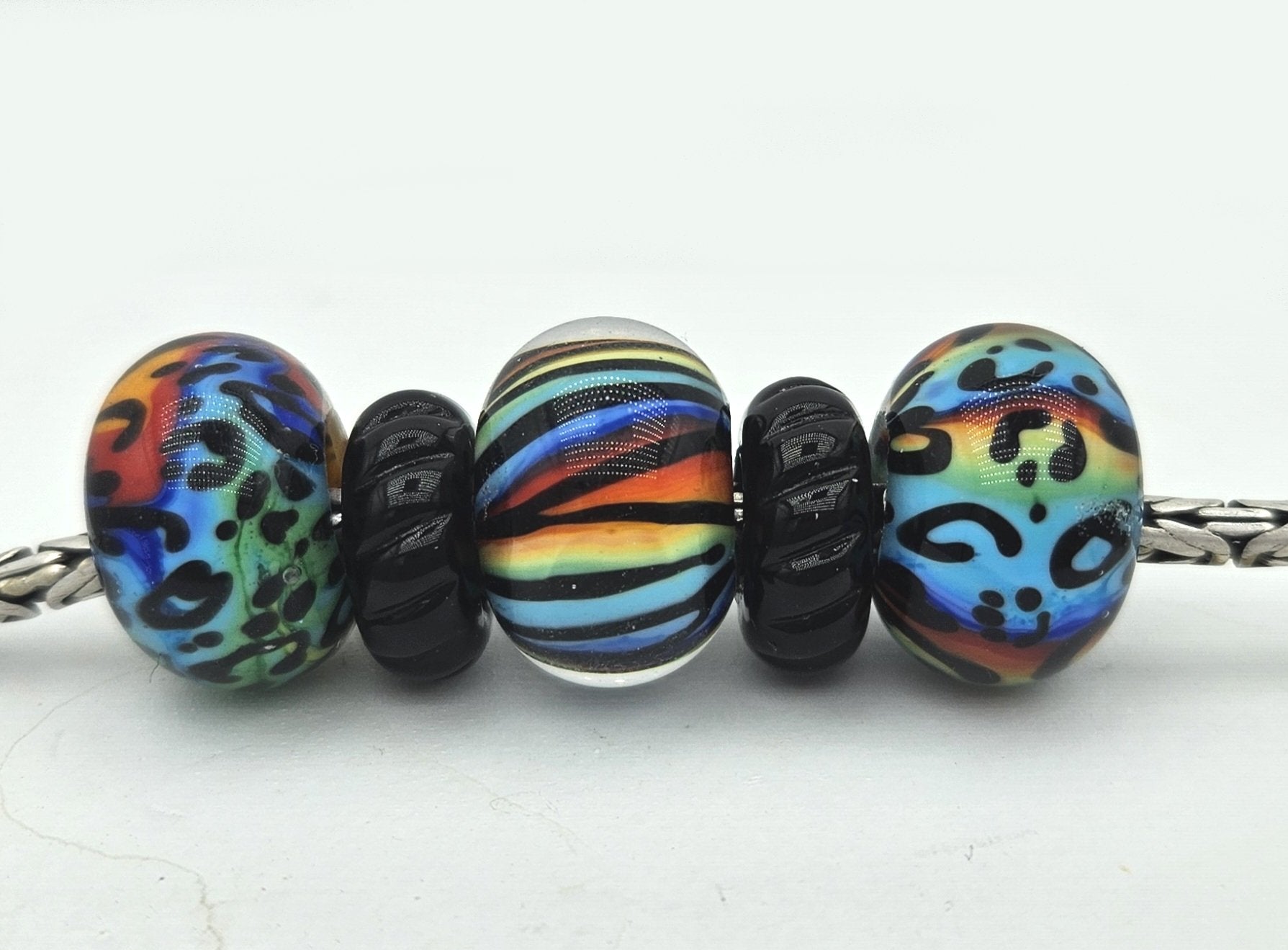 These beads are handmade by the glass artist Elena Tszian. Setting options are 3 in one setting or placed separately along the lead. Price reflects a 3 bead set and you may choose from the available sides, exchange for others available, or if appropriate for the breed all may be used and spaced out on the lead. There is no further charge for all beads but no discount for using 3.